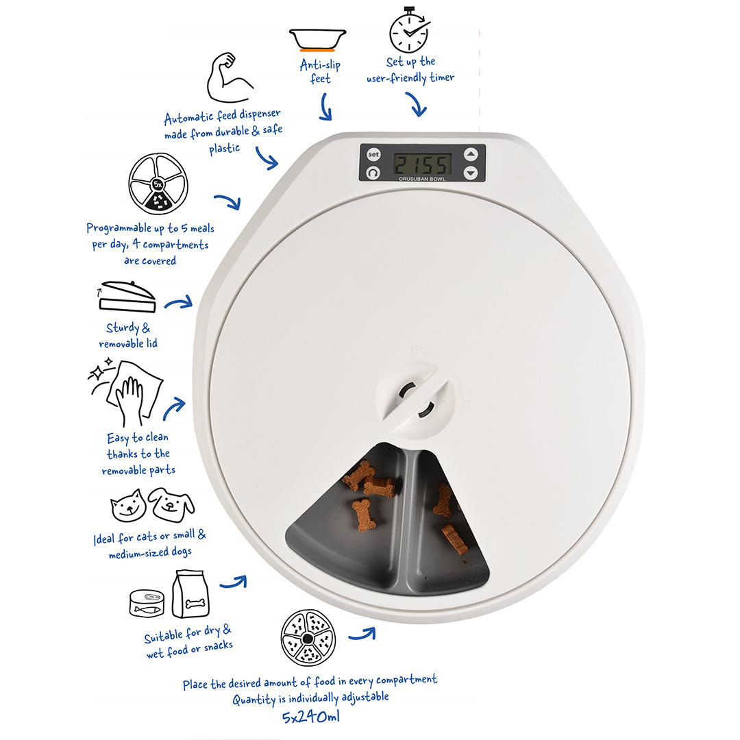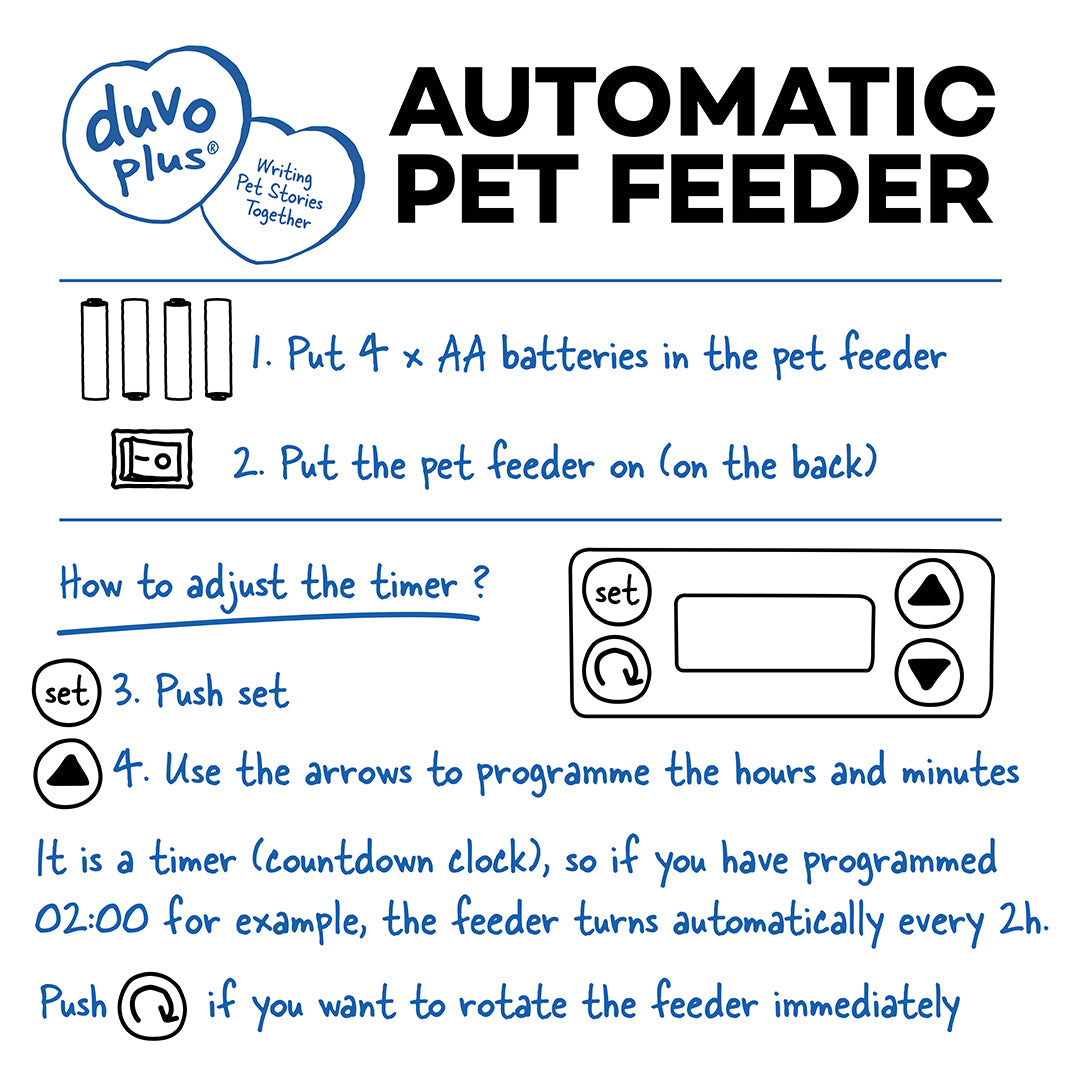 Cu acest distribuitor automat de hrană pentru animale de companie de la duvoplus, vă puteți hrăni animalul de companie la orele și în cantitățile pe care le-ați stabilit în avans. Puteți programa până la 5 mese pe zi. Distribuitorul de hrană este foarte ușor de utilizat și poate fi configurat rapid. Este ideal pentru pisici sau câini de talie mică și mijlocie și poate fi umplut atât cu hrană umedă, cât și uscată sau gustări. Capacul robust protejează hrana foarte eficient împotriva animalelor curioase. Distribuitorul este fabricat din plastic durabil, fiind astfel ușor de curățat. Ideal pentru proprietarii de animale de companie care nu stau mult acasă în timpul zilei și doresc să distribuie mesele pentru puii lor blănoși.