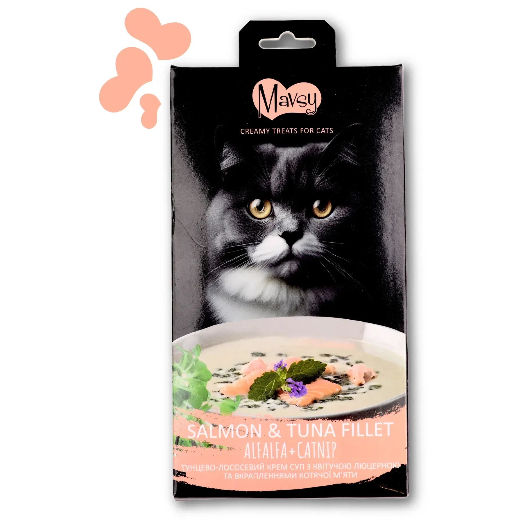 MAVSY Recompense pentru Pisici , Somon si File de Ton cu Lucerna si Iarba Matei , 75g